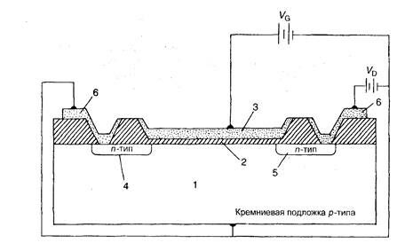затвором. Его схема показана на рис. 2.4. Кремниевые сток (5) и исток (4) с проводимостью n-типа разделены кремниевой подложкой с