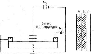 проводимостью р-типа. В качестве диэлектрика (2) используется диоксид кремния. Между стоком и истоком подается напряжение VD. Затво-
