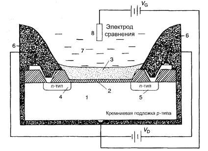 1 — кремниевая подложка; 2 — диэлектрик; 3 — аналит-чувствительная мембрана; 4 — сток; 5 — исток; 6 — изолирующая заливка; 7 — раствор аналита;
