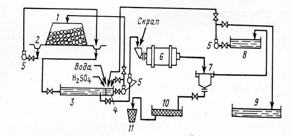 5 – насосы; 6 – цементатор барабанный; 7 – сгуститель;
