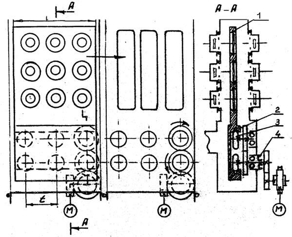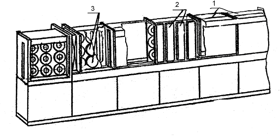 На рис.53,54. представлены общий вид и вид в плане вакуумной линии для нанесения многослойных покрытий на компакт-диски. Видно, что линия состоит из ряда последовательно расположенных прямоугольных камер, герметично соединенных между собой, представляющих единый транспортный коридор. На рис.55 (см.разрез А-А) показано сечение транспортного коридора с приводом проводных транспортных роликов (поз.3), на которые опирается транспортная часть 2 кассеты 1.