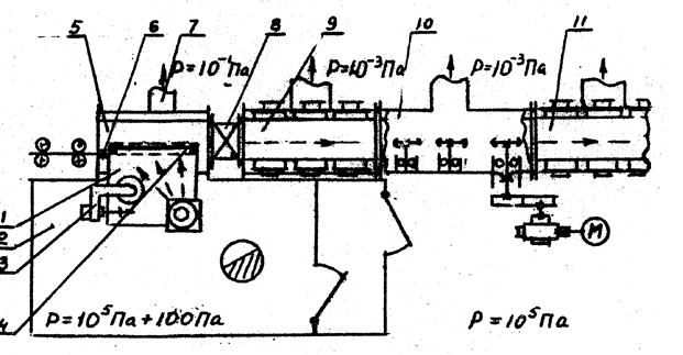 Рассмотрим вакуумные линии непрерывной обработки изделий на нескольких примерах, иллюстрирующих компоновку, обеспечивающую высокий (10-2 –10-3 Па), сверхвысокий (10-5 –10-9 Па), ультравысокий (10-7 –10-10 Па) вакуум. (Термин «ультравысокий» вакуум еще не принят официально, хотя критерий такого вакуума уже сформулирован).