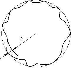 б) Отклонение от круглости – наибольшее расстояние D от точек реального профиля до прилегающей окружности.