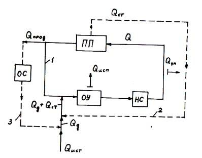 ПП - производство; ОУ - охладительные установки; ОС - очистные сооружения; НС - насосная станция; I - основной цикл водооборота с расходом воды Q ; 2 - встречающийся в практике вариант сброса загрязненных сточных вод Qст в оборотную систему; 3 - возможный цикл очистки и возврата воды продувки основного цикла