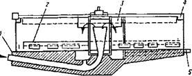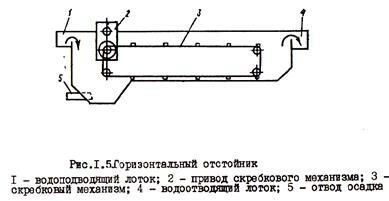 . Глубина отстойников достигает 1,5-4 м, отношение длины к глубине составляет 8-12 (до 20). Ширина отстойника зависит от способа удаления осадка и обычно находится в пределах 6-9 м. По ширине отстойник делится на несколько коридоров. Отстойники оборудуют скребковыми механизмами тележечного или ленточного типа (рис.1.5), сдвигающими выпавший осадок в приямок. Объем приямка равен двухсуточному (не более) количеству выпавшего осадка. Из приямка осадки удаляют насосами, гидроэлеваторами или под гидростатическим давлением. Угол наклона стенок приямка принимают 50-60.