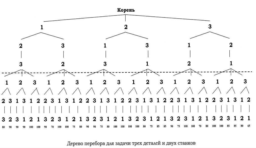 Самым простым является метод выбора расписания путем полного перебора вариантов. Для рассмотренного примера число вариантов равно (3!)2 = 36. Эти варианты показаны на рисунке в виде дерева перебора (часть дерева над пунктирной линией соответствует обработке на первом станке, а под пунктирной линией - обработке на втором станке). Под последним элементом каждого расписания указано значение целевой функции. Возможные варианты расписаний удобно геометрически интерпретировать с помощью диаграмм Ганта. На этих диаграммах каждому станку отводится одна из параллельных прямых, где в некотором масштабе откладываются отрезки, длина которых равна трудоемкости выполняемых работ.