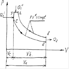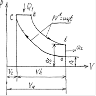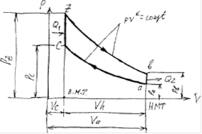 | ac – адиабатическое сжатие, cz – подвод теплоты в количестве, соответствующем процессу горения в реальном двигателе, zb – адиабатическое расширение, ba – отвод теплоты в количестве, соответствующем выпуску в реальном двигателе,