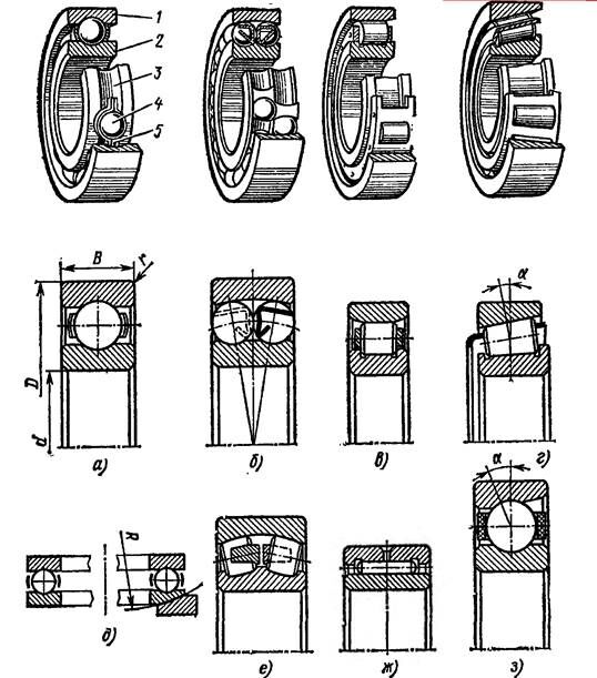 На рис. 5.1 приведены основные виды подшипников. На позициях а, б, в и г дан общий вид подшипника и его графическое изображение, на позициях д,е,ж и з — только графическое изображение.