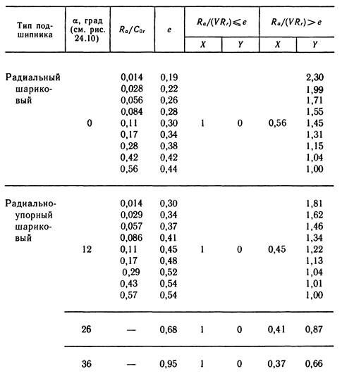X, Y — коэффициенты радиальной и осевой нагрузок (указываются в каталоге, см. также табл. 24.2).