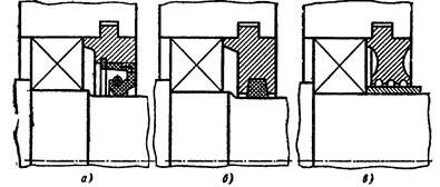 Для защиты от загрязнения и предупреждения утечек смазочного материала подшипниковые узлы снабжают уплотняющими устройствами. Широкое распространение получили уплотнения манжетные (рис. 5.3, а), войлочные (рис. 5.3,6), канавочные (лабиринтные) (рис. 5.3, в) и др. Лабиринтные уплотнения относятся к бесконтактным и являются наиболее совершенными из всех уплотни-тельных средств. Их применяют при любых частотах вращения. Зазор в лабиринтах заполняют пластичным смазочным материалом. Применяют также комбинированные уплотняющие устройства.