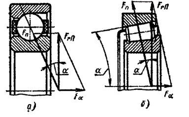 При нагружении радиально-упорного подшипника силой FrП за счет наличия угла давления а (рис. 5.4) возникает собственная осевая сила подшипника Fα, стремящаяся сдвинуть вал (рис. 5.4, а — для шарикового и рис. 5.4,6 —для роликового подшипников). Расчетная осевая сила FαП является результатом действия внешней осевой силы подшипника Fa и собственной осевой силы подшипника Fα. Сила FαП зависит от правильности установки и регулирования осевого зазора в подшипнике.