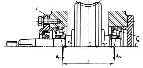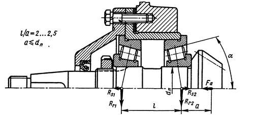 При определении опорных реакций радиально-упорных подшипников пролетом между опорами считают расстояние l с учетом угла контакта α (рис. 24.15 и 24.16).