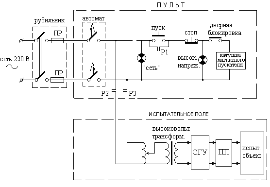 Два разрыва в цепи питания УВН создаются рубильником и автоматом - коммутационным аппаратом, снабженным устройством максимальной защиты по току. Видимый разрыв создается рубильником. В его коробке также размещаются плавкие предохранители. К коммутационным аппаратам питания оборудования испытательного поля относятся также нормально разомкнутая кнопка “пуск” и нормально замкнутая кнопка “стоп”, а также контакты дверной блокировки.