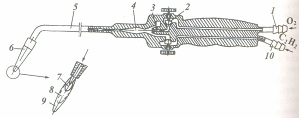 По шлангу через ниппель 1 и регулировочный вентиль 2 в инжектор 3 горелки поступает кислород под давлением 0,3 — 0,4 МПа (3 — 4 кг/см2). Струя кислорода, выходя с большой скоростью из узкого канала инжектора, инжектирует (подсасывает) ацетилен, подводимый к горелке по шлангу через ниппель 10 под небольшим давлением — менее 0,05 МПа. В смесительной камере 4 кислород смешивается с ацетиленом, откуда смесь по смесительной трубке 5 движется к наконечнику 6 горелки.