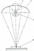 Мощная дуговая ксеноновая лампа сверхвысокого давления / помещается в фокусе эллипсоидного отражателя 2. Для более полного использования лучистого потока лампы служит контротражатель 3. Отраженные лучи света от эллипсоидного отражателя, фокусируются на нагреваемом (свариваемом) изделии 4, образуя так называемое фокальное пятно. Оптическую схему можно несколько усложнить, если на пути движения отраженных лучей поставить линзовый объектив, позволяющий уменьшить диаметр фокального пятна.