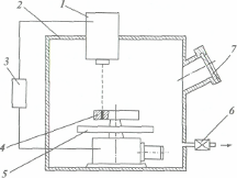 1 — электронная пушка; 2 — герметичная камера; 3 — высоковольтный источник питания; 4 — свариваемое изделие; 5 — манипулятор; 6 — вакуумная система; 7 — смотровое стекло.