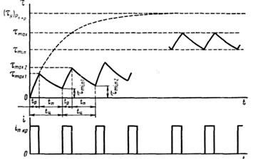 В течение первого цикла за время tр1 аппарат нагревается до не­которого превышения температуры , а за время первой паузы tп1 произойдет его охлаждение до . Во втором цикле нагрев аппа­рата начнется при=  и за время tр2 будет достигнуто пре­вышение температуры , но так как                              то >. За время второй паузы tn2 аппарат охладится и в конце второго цикла опять будет иметь место превышение температуры, которое будет больше, чем . Если такие циклы будут периодически повторяться достаточно долго, то в конце концов установится процесс колебания температуры аппарата, так назы­ваемый квазиустановившийся режим.