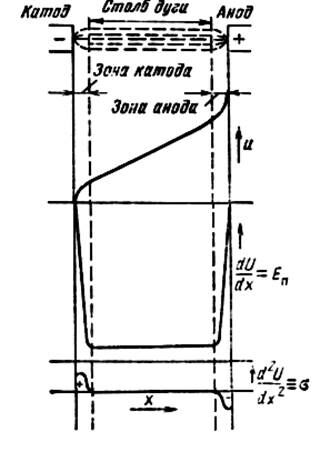 В дуговом разряде можно различить три характерные области: околокатодную, область столба дуги, околоанодную. В каждой из этих областей процес