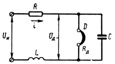 На рис. 8.5 была изображена электрическая цепь постоянного тока с дугой. Принципиально во всех реальных схемах присутствует емкость С (емкости между токоведущими проводами, проводами и землей и т. д.). Но обычно в процессе горения дуги D через С протекают относительно небольшие токи в сравнении с основным током цепи i, и влияние С обычно не учитывается. Это влияние становится заметным в конце процесса гашения дуги, когда ток i приближается к нулевому значению, а напряжение на дуговом промежутке резко возрастает. При таком допущении общее уравнение баланса напряжений для цепи с дугой будет выглядеть следующим образом: