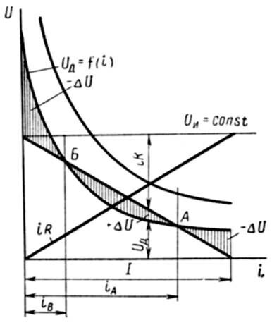 , должны быть отрицательными. Это возможно только в том случае, когда слева от точки А ток возрастает, а справа — убывает. В точке Б это условие равновесия не обеспечивается, так как справа от нее ток возрастает (переходит в точку А), а слева - убывает (дуга угасает), точка Б характеризует собой неустойчивое равновесие.