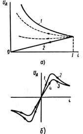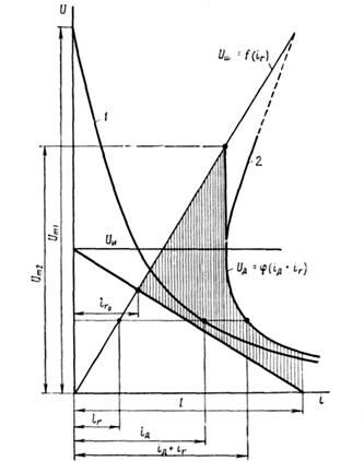 когда не будет пересечения этих кривых и не возникнет точка А. В этом случае ток в цепи со значения I будет убывать до нуля. Во всем диапазоне изменения тока от I до 0 будет сохранено условие