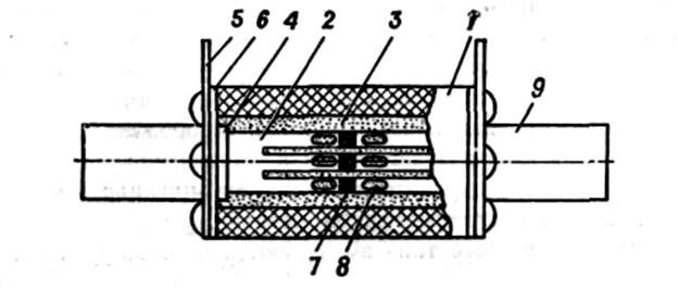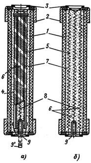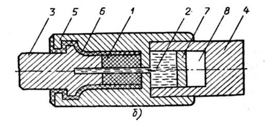 Вставка располагается в герметичном трубчатом патроне, который состоит из фибрового цилиндра 3, латунной обоймы 4 и латунного колпачка 5.