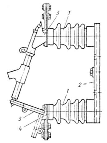 в) Стреляющие предохранители. Для работы на открытом воздухе при напряжении 10 и 35 кВ и отключаемом токе до 15 кА применяются так называемые стреляющие предохранители типов ПСН-10 и ПСН-35. На рис. 11.8 показан патрон предохранителя ПСН-35. В корпусе 1 установлены две винипластовые трубки 2 и 3, соединенные стальным патрубком 4. Плавкая вставка 5 присоединяется к токоведущему стержню 6 и гибкому проводнику 7, соединенному с наконечником 8. Патрон, установленный на изоляторах, показан на рис. 11.9. Изоляторы1 крепятся к стальному цоколю 2. Цепь присоединяется к выводам 3 и 4. Вращающийся контакт 5 действует на наконечник 8 (рис. 11.8) и с помощью своей пружины стремится вытащить гибкий проводник 7 из трубки 3. При перегорании плавкой вставки образуется дуга, которая, соприкасаясь со стенками трубки, разлагает их, и образующийся газ поднимает давление в трубке. При вытягивании наконечника из трубки длина дуги увеличивается, давление возрастает. При больших токах мембрана 9 в патрубке 4 разрывается и дуга гасится поперечным дутьем. Если ток невелик, то дуга гасится продольным потоком газа, который вырывается из трубки после выброса гибкого контакта 7 из трубки. Длительность горения падает при увеличении тока. При больших токах дуга гаснет за 0,04 с. При малых токах (800—1000 А) время горения возрастает до 0,3 с.