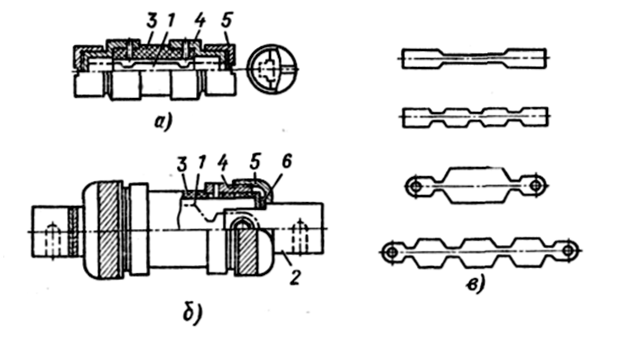 а) Предохранители с гашением дуги в закрытом объеме. Прсдохранители на токи от 15 до 60 А имеют упрощенную конструкцию. Плавкая вставка 1 прижимается к латунной обойме 4 колпачком 5, которые является выходным контактом (рис. 16.3, а). Плавкая вставка 1 штампуется из цинка, являющегося легкоплавким и стойким к коррозии материалом. Указанная форма вставки позволяет получить благоприятную времятоковую (защитную) характеристику. В предохранителях на токи более 60 А плавкая вставка 1 присоединяется к контактным ножам 2 с помощью болтов (рис. 11.2, б).