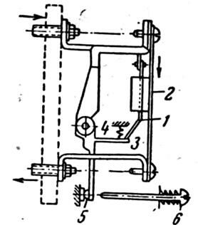 Среди конструкций тепловых реле с биметаллом наибольшее распространение получили реле с биметаллическими пластинами. Так на рис.14.10 представлено схематическое устройство теплового реле с биметаллической пластинкой. При нагреве от обтекаемого током элемента 2, биметаллическая пластинка 1 изгибается. При определенной температуре (температуре срабатывания) пластинка изгибается настолько, что освобождает защелку 3 подвижного контакта, который под действием пружины 4 поворачивается и размыкает контакты 5 реле. Реле же не имеет самовозврата, возврат контактов ручной, осуществляется кнопкой 6 и может быть произведен только после достаточного остывания биметаллической пластинки (через 15 – 90 с.). Нагревательный элемент является сменным, и подбором соответствующего элемента осуществляется настройка реле. Так для реле ТТ – 10, 11, 12 имеется 54 стандартных нагревательных элемента на токи от 0,6 до 150 А.