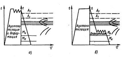 Рис. 13.1. Схема термомеханической обработки стали: а – ВТМО; б – НТМО (заштрихованная зона – интервал температур рекристаллизации)