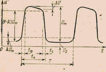 Участок импульса, на котором происходит отклонение напряжения от исходного уровня, называется фронтом, а участок импульса, где напряжение возвращается к исходному уровню — спадом (срезом). В реальном импульсе, когда бывает трудно точно указать границы фронта и спада, их длительности tф и tс отсчитывают между определенными уровнями напряжения