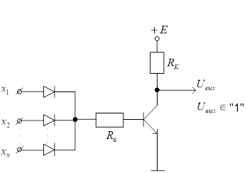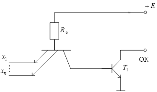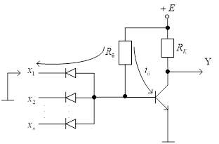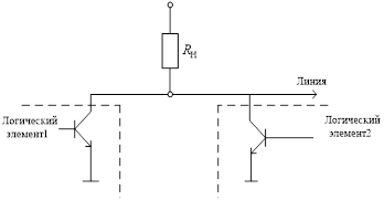 В этом случае любой из транзисторов, переводимый в режим насыщения, приводит к логическому «0» в линии (=> ИЛИ).