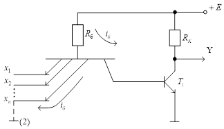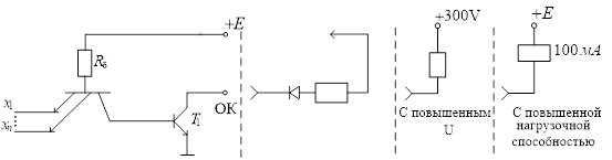 Используется для элементов индикации, элементов коммуникации, для создания общих шин вычислительных систем (монтажное ИЛИ). Для функционирования элемента коллектор соединяется через внешние связи с +Е. Например, элемент индикации: