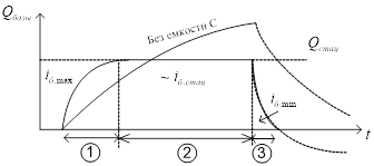 В положении «включено», когда контакты К замкнуты, можно, пренебрегая сопротивлением контактов, считать выходное напряжение равным нулю. В положении «выключено», когда контакты К разомкнуты, при отсутствии нагрузки ток i не протекает, падение напряжения uR на резисторе R равно нулю и, следовательно, напряжение на выходе определяется напряжением источника питания Е. Изменение напряжения на выходе при размыкании контактов происходит скачком. Рассмотренный режим работы ключа является идеальным. Мощность, рассеиваемая на коммутирующем приборе К этого ключа, равна нулю: при прохождении тока в положении «включено» равно нулю выходное напряжение, а в положении «выключено» при ивых = Е равен нулю ток.