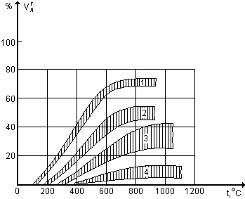 Выход летучих веществ из твердых топлив происходит в интервале температур от 160 до 1100 °С, но наибольший имеет место в области температур 400…800°С (рис. 3.4). Условно количественный выход летучих веществ из твердого топлива определяется по уменьшению массы пробы топлива после выдержки в тигле при температуре 850 ± 25°С в течение 7 мин без доступа воздуха и относится к составу горючей массы топлива VГЛ , %.