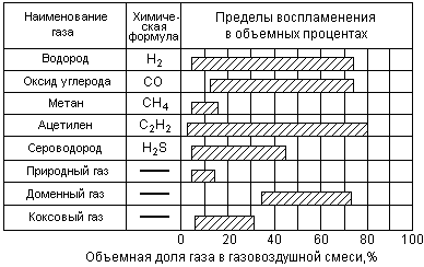 Рис.3.6. Пределы воспламенения газовоздушных смесей при 20 °С и Р = 0,1 МПа