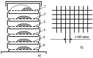 | Рис.3.7. Производство ситового анализа пыли на комплекте из пяти сит: а - комплект сит с рассевом пыли; б - вид решетки сита; 1…5 - сита с размерами ячейки соответственно 1000, 500, 200, 90, 50 мкм; 6 - поддон; х - размер ячейки сита. |