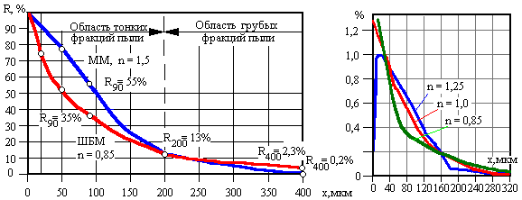 Значение коэффициента b изменяется в пределах 0,0025…0,1; чем тоньше пыль, тем меньше коэффициент b. Коэффициент n характеризует структуру пыли, распределение частиц по размерам и может быть больше или меньше единицы. Значения коэффициентов b и n для данного топлива и системы пылеприготовления зависит от типа сепаратора и мельницы, его определяют путем рассева порции полученной пыли на двух ситах, чаще всего размером ячейки 90 и 200 мкм, т.е. получают два опытных значения RX.