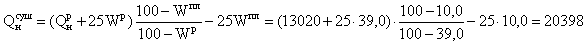 Связь между низшей теплотой сгорания рабочей и условно горючей массой топлива выражается следующей формулой