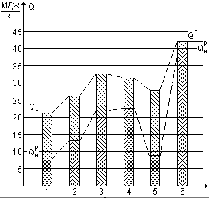 На рис. 3.2 показано соотношение средних значений QРН и QГН для различных групп топлива. Различие между ними тем меньше, чем меньше в топливе внешнего балласта.