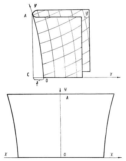 Третий вид – линия сгиба не совпадает с нитью ткани, перекос нитей имеет место в обоих слоях. К третьему виду относятся задние половинки брюк, нижние участки рукавов с линией сгиба по переднему перекату и др. Схематично первый, второй и третий способы образования кривой линии сгиба и развертки плоских оболочек представлены на рис. 5.1-5.3.