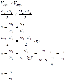 В отличие от зубчатых передач, витки червяка скользят по зубу червячного колеса, а не обкатываются. По этой причине окружные скорости червяка и червячного колеса не совпадают по величине и направлению.