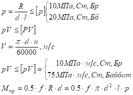 Расчет производится по условной удельной нагрузке Р[МПа], характеризующей износостойкость, а также по условному произведению PV, характеризующему тепловой режим подшипника PV [Мпа м/с].