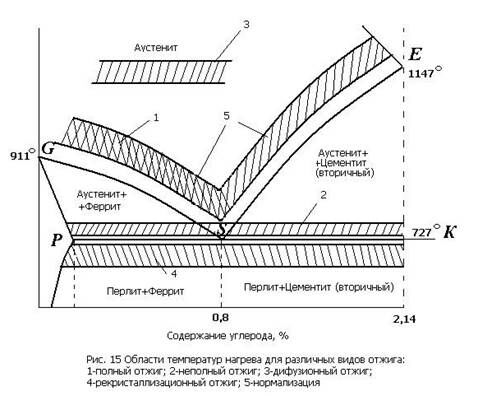 При неполном отжиге нагрев производится на 30…50 °С выше линии РSК диаграммы Fе-Fе3С (рис. 15). Он производится, если исходная структура не очень крупнозерниста или не надо изменить расположение ферритной (в доэвтектоидных сталях) или цементитной (в заэвтектоидных сталях) составляющей. При этом происходит лишь частичная перекристаллизация — только перлитной составляющей стали.