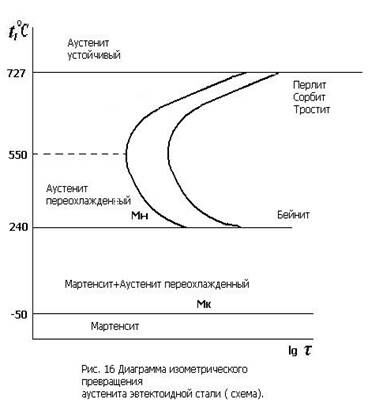 Превращения в стали при охлаждении. При медленном охлаждении стали образуются структуры, соответствующие диаграмме Fе-Fе3C. Вначале происходит выделение феррита (в доэвтектоидных сталях) или вторичного цементита (в заэвтектоидных сталях), а затем происходит превращение аустенита в перлит. Это превращение заключается в распаде аустенита на феррит, почти не содержащий углерода и цементит, содержащий 6,67 % С. Поэтому превращение сопровождается диффузией, перераспределением углерода. Диффузионные процессы происходят в течение некоторого времени, причем скорость диффузии резко падает с понижением температуры. Обычно изучают изотермическое превращение аустенита (происходящее при выдержке при постоянной температуре) для эвтектоидной стали. Влияние температуры на скорость и характер превращения представляют в виде диаграммы изотермического превращения аустенита (рис. 16).