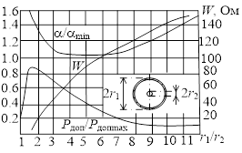Допустимая мощность определяется из (2.10). На рис. 1.26 представлены зависимости затухания, допустимой передаваемой мощности и волнового сопротивления коаксиала от отношения r1 / r2. Из графиков следует, что для уменьшения потерь и увеличения пропускаемой мощности желательно пропорционально увеличивать размеры r1 и r2. Это увеличение ограничивается условием одноволновости коаксиала (1.50). Оптимальное соотношение радиусов проводников коаксиала (r1 / r2 = 3,6), обеспечивает минимальные потери при минимальном волновом сопротивлении Wорt = 100 Ом. При r1 / r2 = 1,65 обеспечивается максимальная электрическая прочность при Wорt = 30 Ом. В качестве стандартных выбраны следующие значения волновых сопротивлений коаксиалов: 50, 75, 100 и 150 Ом.