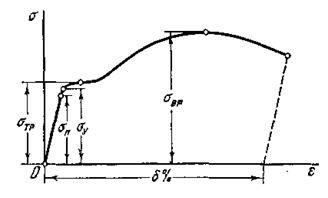 Чтобы дать количественную оценку описанным выше свойствам материала, перестроим диаграмму растяжения в координатах σ и ε. Эта диаграмма имеет тот же вид, что и диаграмма растяжения, но будет характеризовать уже не свойства образца, а свойства материала. Отметим на диаграмме характерные точки и дадим определение соответствующих им числовых величин. Наибольшее напряжение, до которого материал следует закону Гука, называется пределом пропорциональности σп. Величина предела пропорциональности зависит от той степени точности, с которой начальный участок диаграммы можно рассматривать как прямую.
