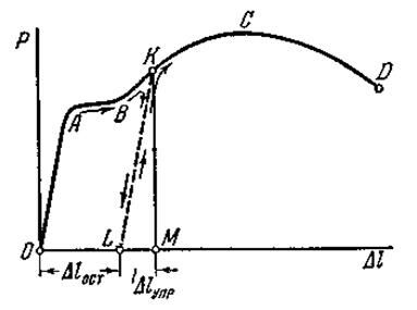 Если испытуемый образец, не доводя до разрушения, разгрузить, то в процессе разгрузки зависимость между силой и удлинением изобразится прямой KL. Опыт показывает, что эта прямая параллельна прямой ОА. При разгрузке удлинение полностью не исчезает. Оно уменьшается на величину упругой части удлинения (отрезок LM). Отрезок OL представляет собой остаточное удлинение. Его называют также пластическим удлинением, а соответствующую ему деформацию — пластической деформацией. При повторном нагружении образца диаграмма растяжения принимает вид прямой LK и далее — кривой KCD, как будто промежуточной разгрузки и не было.