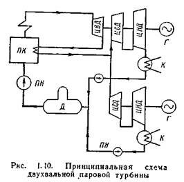 Помимо одновальных турбин известны двухзальные паровые турбины большой мощности (рис. 1.10). В установках этого типа пар, пройдя через ЦВД первого вала, направляется сначала в ПСД этого же вала, а затем в ЦСД второго вала. Пройдя ЦСД каждого из валов, пар поступает в соединенные с ними ЦНД. Каждый вал приводит в действие один генератор. Соотношение мощностей генераторов первого и второго валов в ряде случаев 100: 60%.