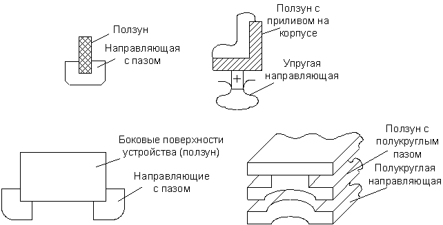 По конструкции направляющие бывают: индивидуальные (применяемые для одного ползуна); групповые (рассчитанные на несколько ползунов); совмещенные (например, с разъемом).